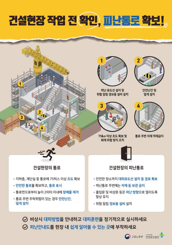 건설현장 작업 전 확인사항, 피난통로 확보 포스터