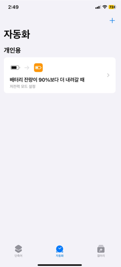5. 가운데 자동화 버튼에서 배터리 잔량이 90%보다 더 내려갈 때, 저전력 모드 설정으로 하세요~^^