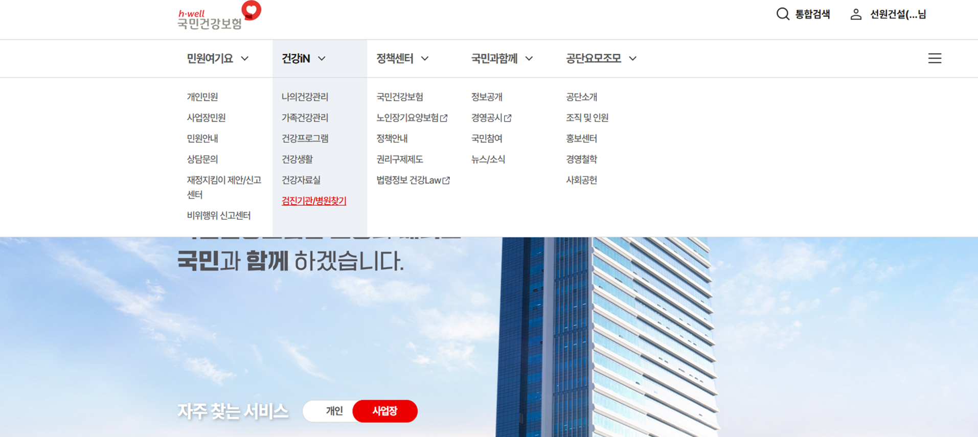 1. 인터넷 검색창에 "국민건강보험공단" 입력 후 접속 → [건강in→검진기관/병원찾기] 클릭