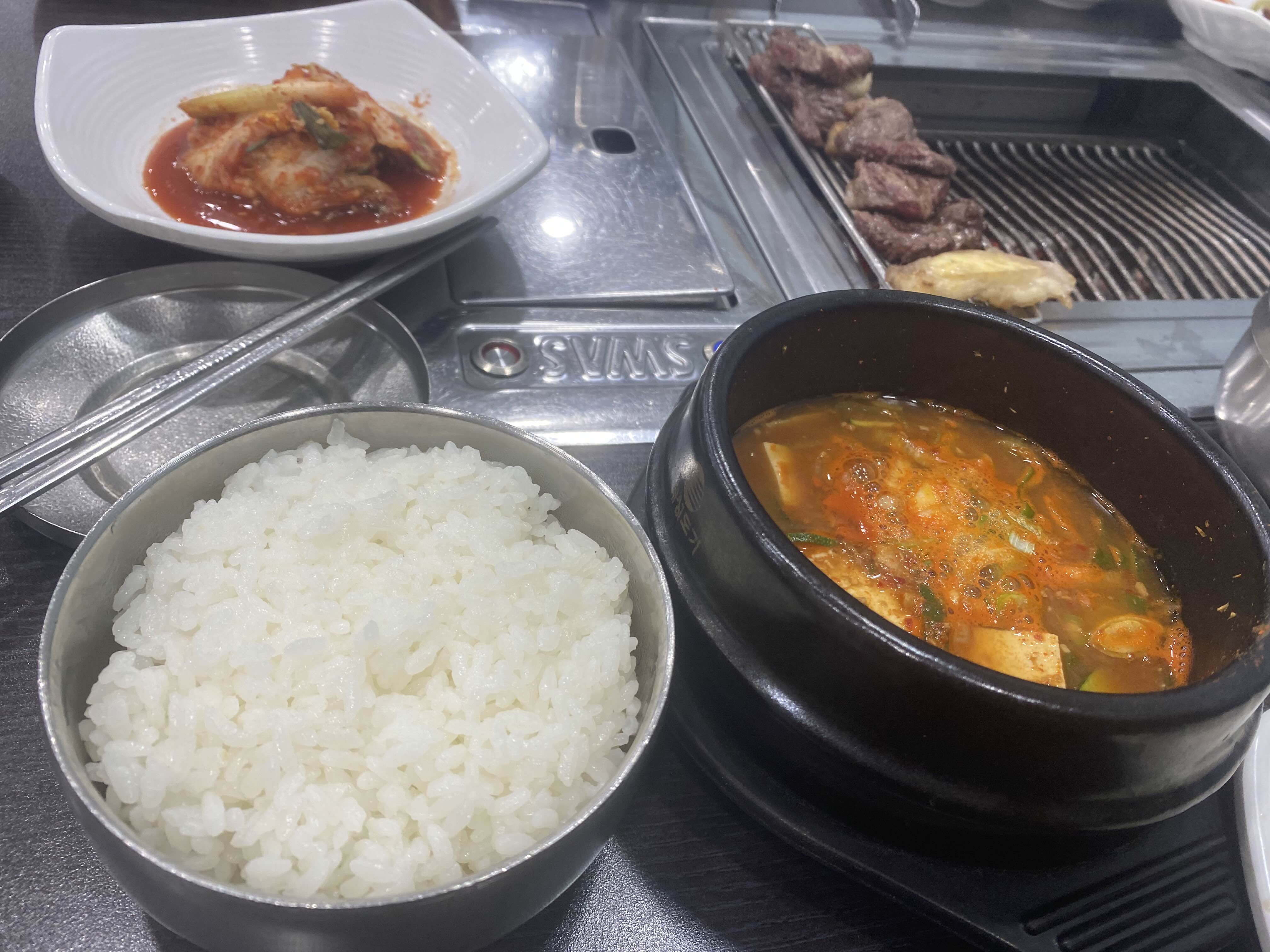 고기먹고 된장찌개 밥은 2,000원이예요 후식 비냉 물냉면도 양이 적당히 나와용. 모든 주문은 키오스크로 깔끔하게 주문합니당. 고기 상차림비는 인당 5,000원 입니다~^^